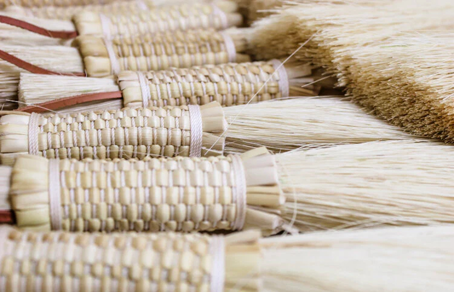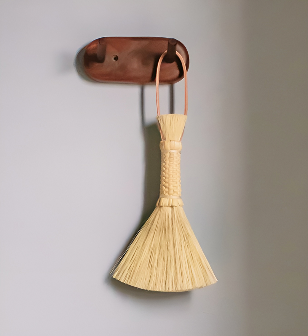 Soft Tampico brush made from agave fibers, tied with pale rose nylon, on a traditional broomcorn handle. Undyed.